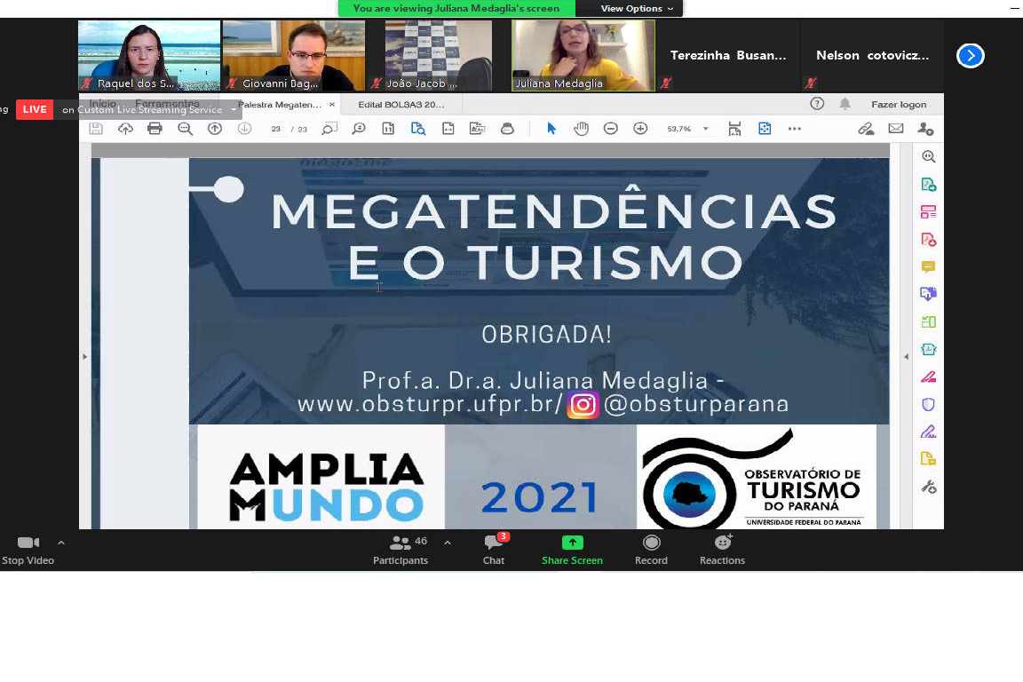 MEGATENDÊNCIAS E O TURISMO NO PARANÁ - A reunião teve também a apresentação da Professora do departamento de turismo da Universidade Federal do Paraná (UFPR), Juliana Medaglia. Ela apresentou as Megatendências do Turismo, pesquisa que foi realizada a partir de uma parceria entre o Observatório de Turismo do Paraná e a plataforma Amplia Mundo. “Nós tínhamos uma inquietação relacionada ao futuro da sociedade e do turismo, como vamos pensar os novos profissionais do turismo, se a gente não pensar no contexto da sociedade”, foi a partir dessa ideia que a pesquisa começou a ser desenvolvida.
