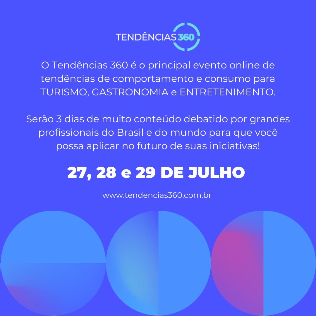 Com o objetivo de olhar, discutir e pensar sobre o futuro do turismo, gastronomia e entretenimento o evento Tendências 360 realiza a sua segunda edição online. Com novidades, a programação deste ano é focada nos temas Fun, Food e Travel e trará palestrantes nacionais e internacionais, além de cases de empresas inovadoras e painéis para debater as principais tendências destes segmentos.